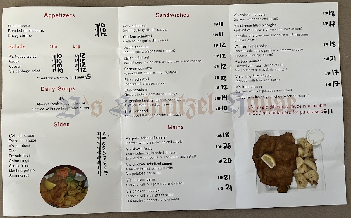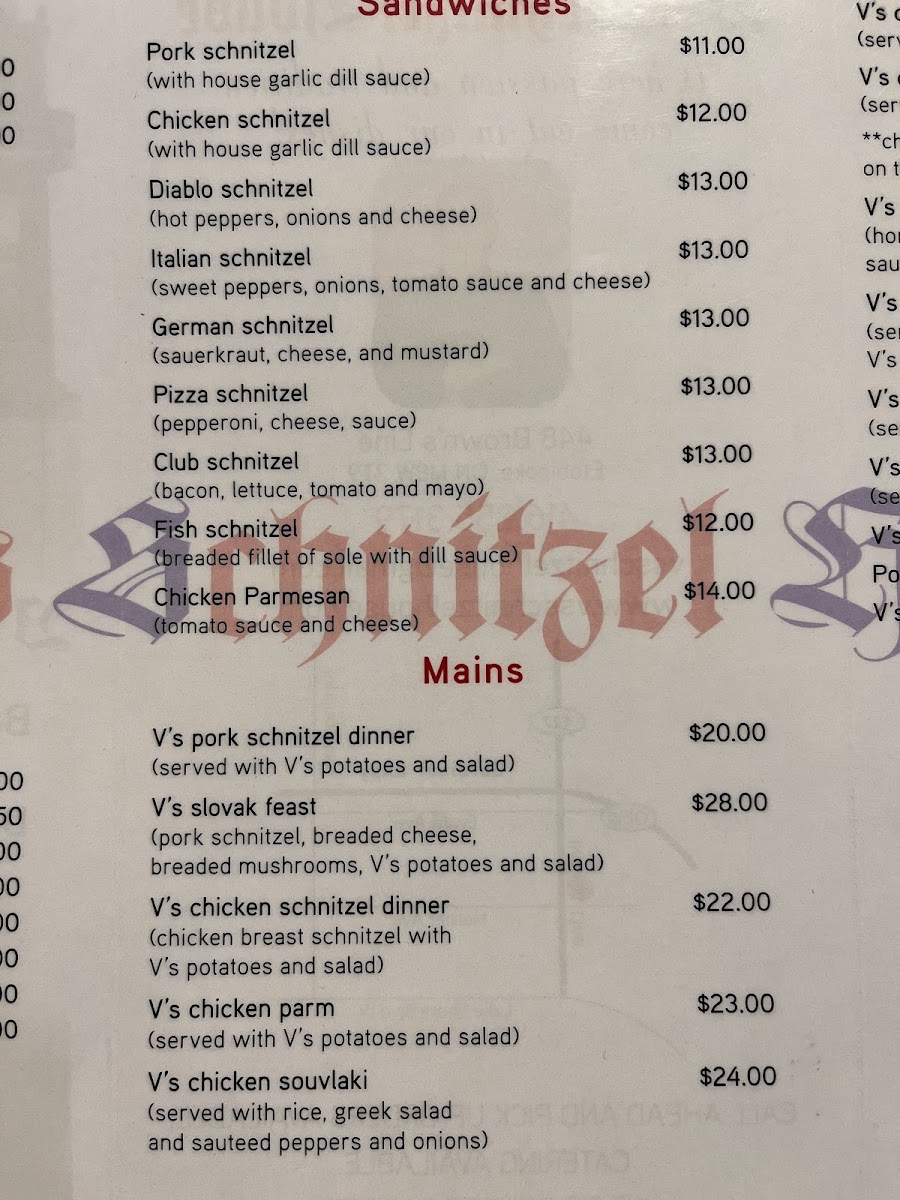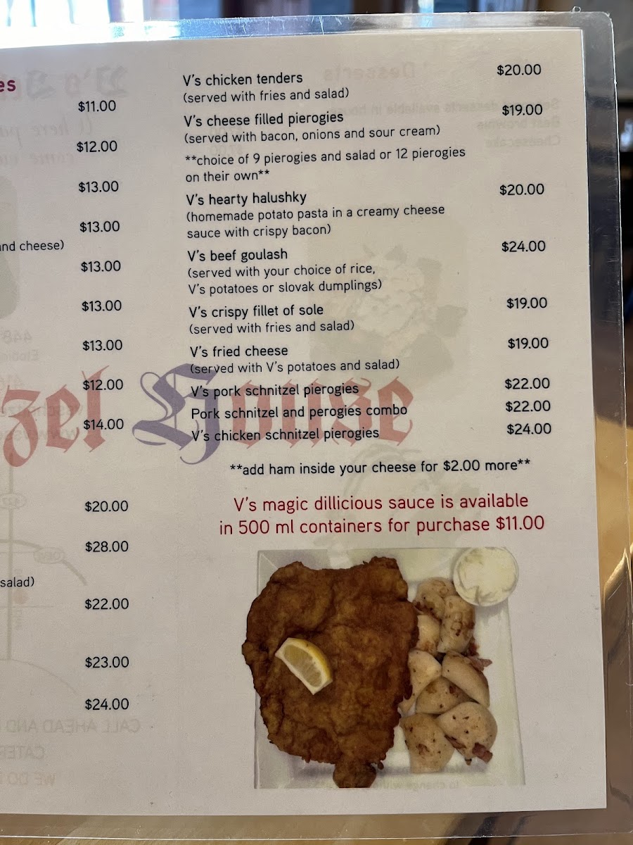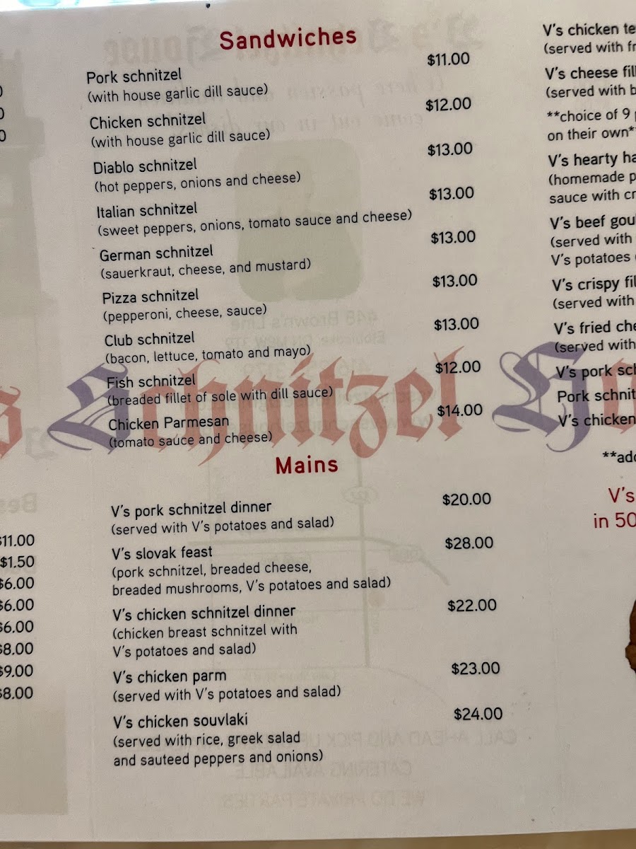 Among the standout menu items is the V's Slovak Feast, a generous platter featuring a massive pork schnitzel paired with seasoned crispy potatoes, a fresh veggie salad, and tempting breaded mushrooms and cheese. The unique combination of flavors and textures ensures a satisfying experience that keeps customers returning for more.